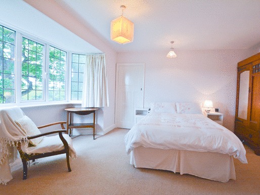 Bedroom 2 - Spacious room with double bed and one single bed, bow window with views overlooking river and countryside. Wardrobe, dresser with drawers and morror, hair dryer.