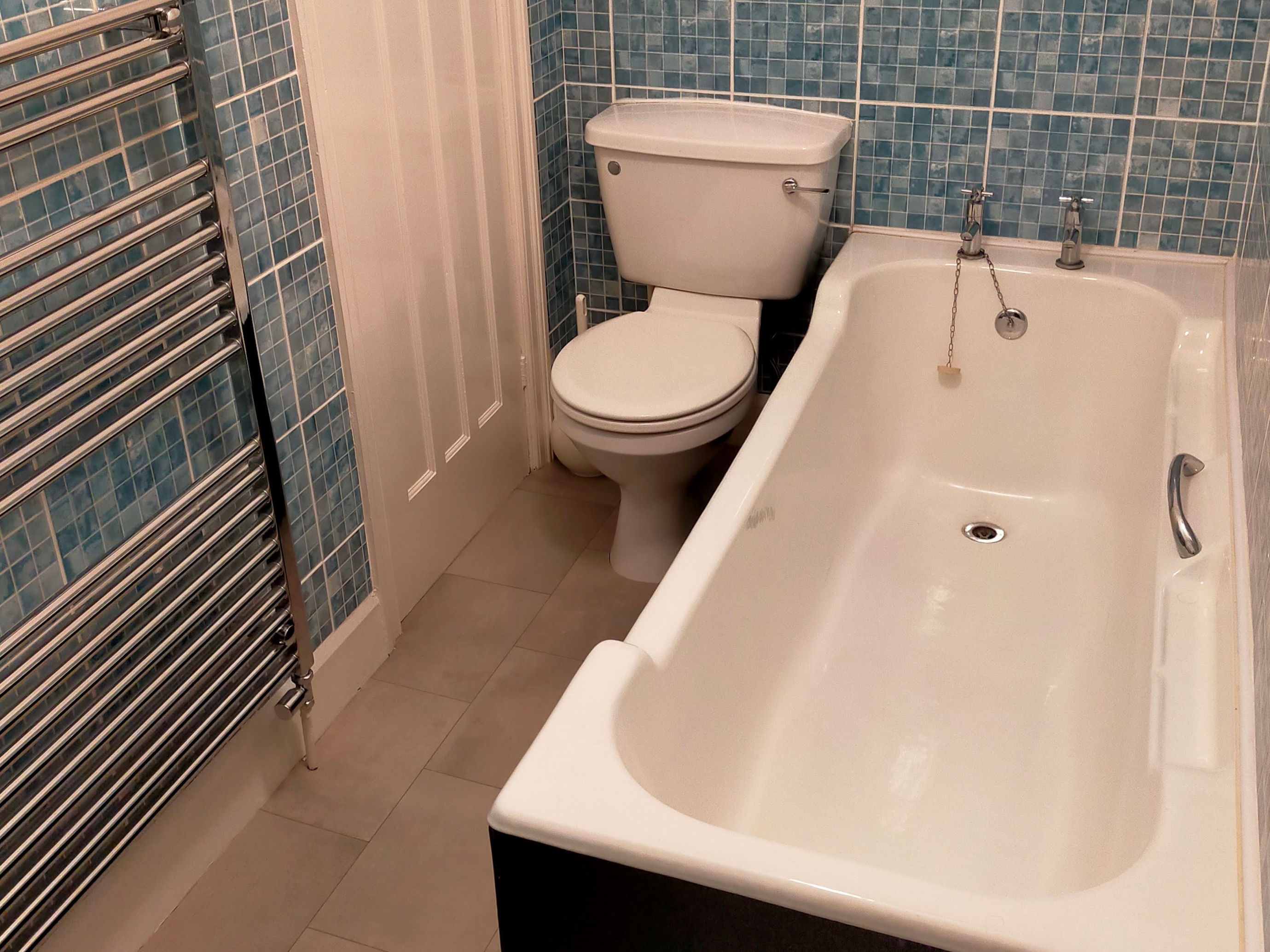 Bathroom with large bath, over bath electric shower, wash basin and WC.